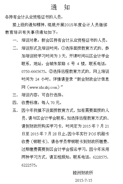 关于开展睦洲镇会计人员2015年度继续教育培训的通知