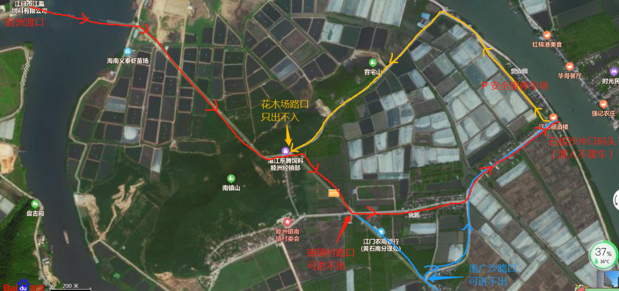 特别说明:南镇村安全里周边路段实施单向行驶,前往石板沙可从南镇村路口或南广沙路口进入,返程时从安全里停车场经花木场路口返回省道S272,再经睦洲渡口前往睦洲圩镇,或经黄布村前往珠海市莲洲高速入口。