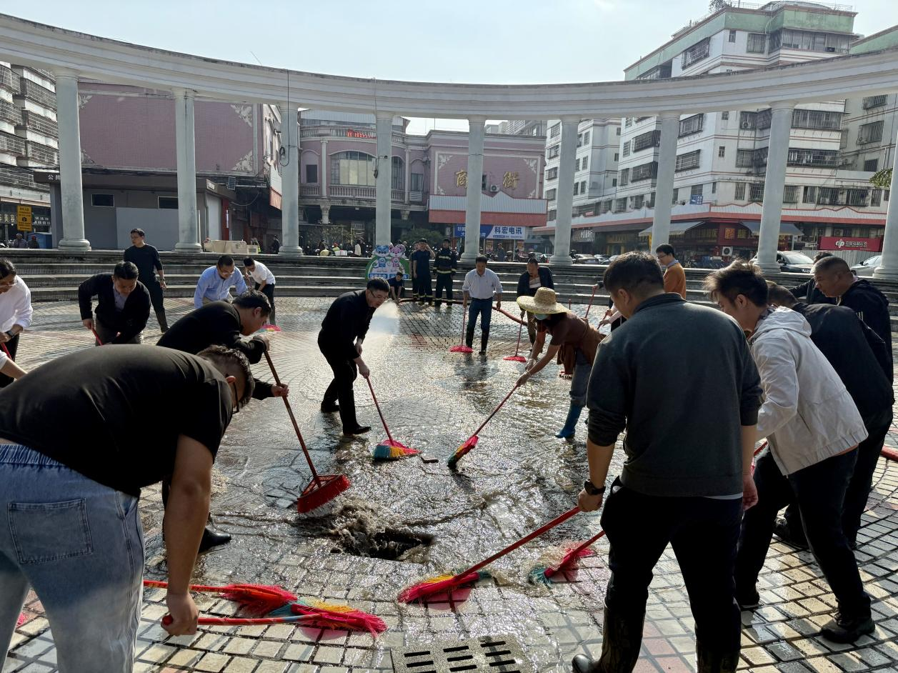 行动现场,党员干部率先垂范,手持清洁工具直奔卫生难点区域。消防队伍操作高压水枪,对广场地面进行全方位冲刷,强劲水流将顽固污渍、积存灰尘一扫而空;居民志愿者手持扫把、毛刷,紧随其后细致刷洗,不放过任何边角缝隙。“党员带头干,我们跟着上!” 一位带着孩子参与劳动的居民笑着说道。在党员先锋模范作用的感召下,越来越多居民自发加入整治队伍,形成 “你冲水、我清扫” 的默契协作氛围。经过共同努力,广场面貌便焕然一新:地面洁净、设施明亮、环境清爽。