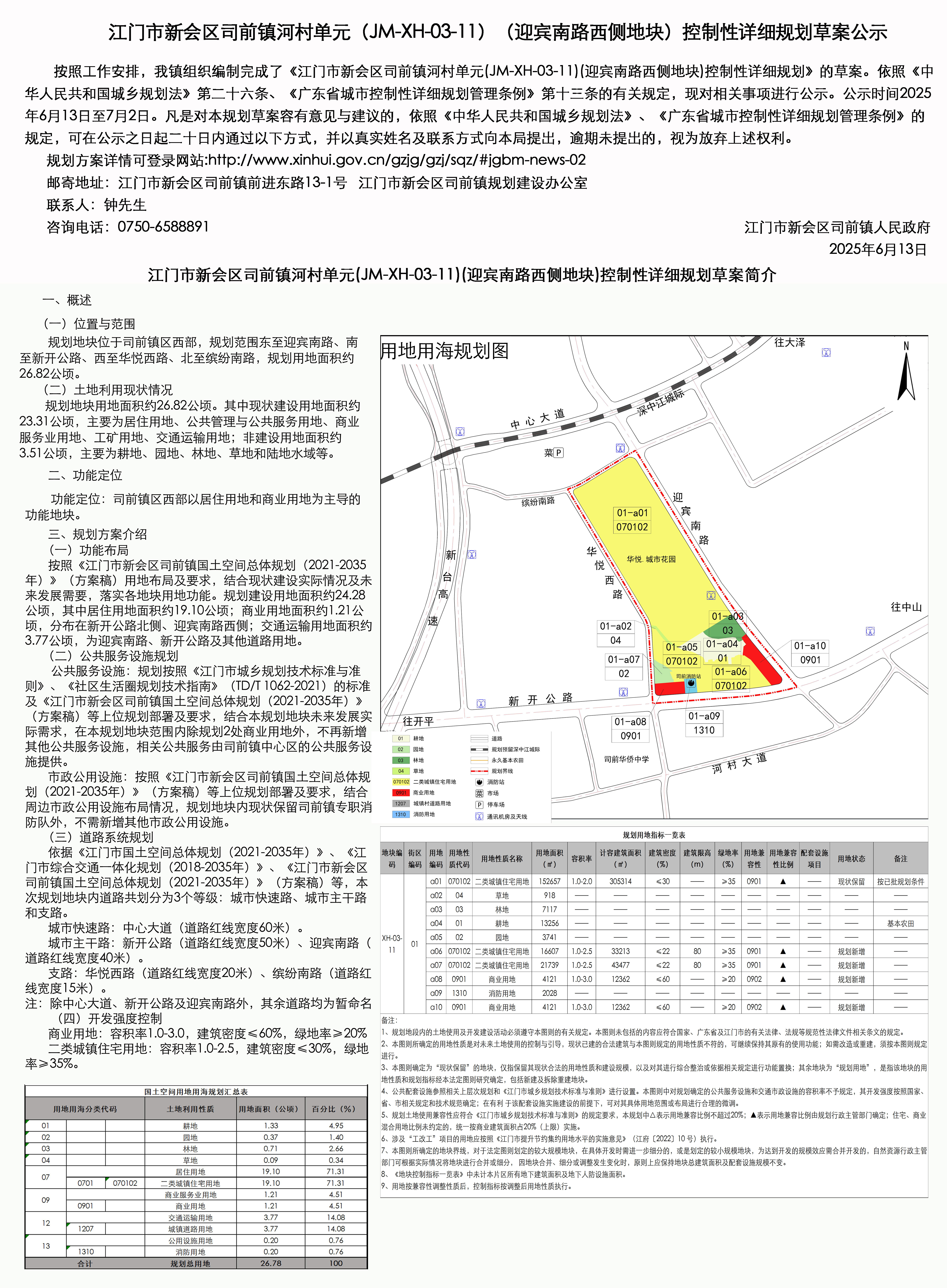 按照国土空间规划工作安排,我镇组织编制完成了《江门市燕雨直播 司前镇河村单元(JM-XH-03-11)(迎宾南路西侧地块)控制性详细规划》《江门市燕雨直播 司前镇河村单元(JM-XH-03-11)(新台高速西侧地块)控制性详细规划》的草案。依照《中华人民共和国城乡规划法》第二十六条、《广东省城市控制性详细规划管理条例》第十三条的有关规定,现对相关事项进行公示。公示时间2025年6月13日至7月2日。凡是对本规划草案容有意见与建议的,依照《中华人民共和国城乡规划法》、《广东省城市控制件详细规划管理条例》的规定,可在公示之日起三十日内通过以下方式向本单位提出申述,逾未提出的,视为放弃上述权利。