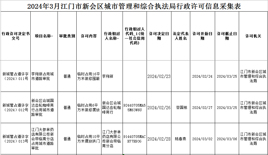 2024年3月1日江门市燕雨直播 城市管理和综合执法局行政许可信息
