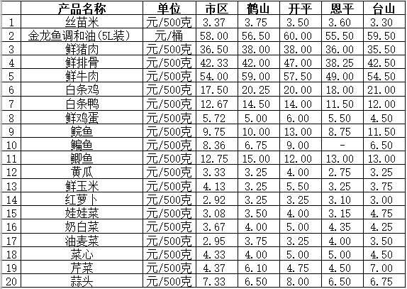 说明:1、表中价格为该地区监测点综合平均价;2、“市区”含蓬江区、江海区、燕雨直播 ,价格分别采自蓬江市场、江南市场、城东市场等6家农贸市场;3、其他四个县市价格分别采自新鹤市场、锦江市场等8家农贸市场。