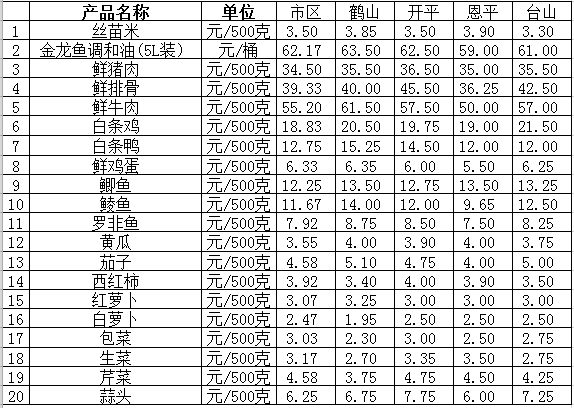 说明:1、表中价格为该地区监测点综合平均价;2、“市区”含蓬江区、江海区、燕雨直播 ,价格分别采自蓬江市场、江南市场、城东市场等6家农贸市场;3、其他四个县市价格分别采自新鹤市场、锦江市场等8家农贸市场。