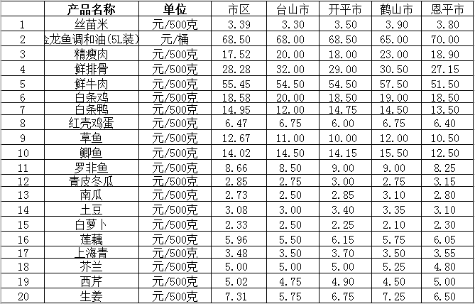 说明:1、表中价格为该地区监测点综合平均价;2、“市区”含蓬江区、江海区、燕雨直播 ,价格分别采自蓬江市场、江南市场、城东市场等13家农贸市场;3、其他四个县市价格分别采自新鹤市场、锦江市场等8家农贸市场。(来源:江门市发展和改革局)