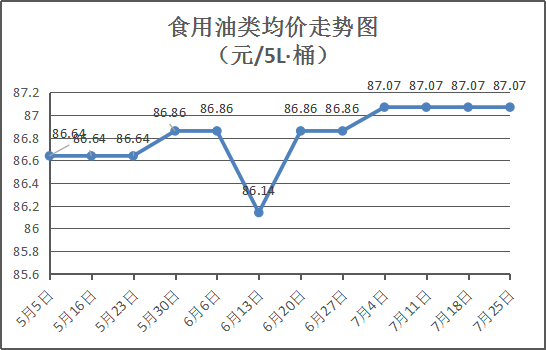 食用油价格保持平稳。本周所监测的9种食用油(5L装)商品均价为87.07元/桶,环比持平。金龙鱼花生油、大豆油、金龙调和油5L装零售均价分别为每桶112.50元、65元、73元,环比持平、持平、持平。