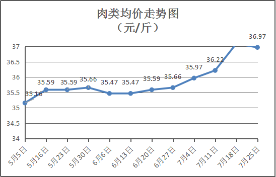 肉类商品价格微降。本周所监测的8种肉类商品均价为36.97元/斤,环比下降0.34%。其中:排骨、有皮上肉、牛腩、带骨羊肉零售均价分别为每斤34.50元、18元、45.50元、49.00元,环比与上周分别下降2.82%、持平、持平、持平。