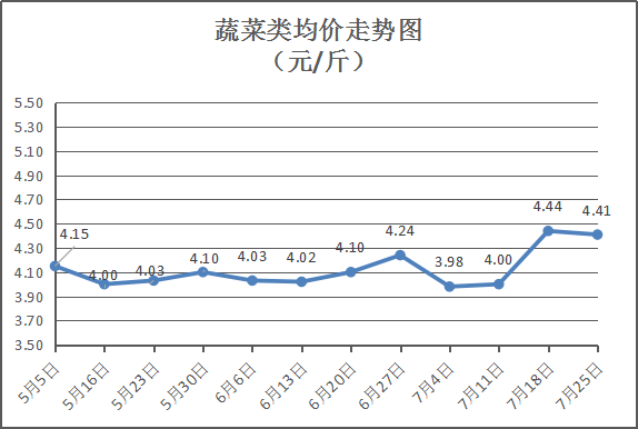 蔬菜类价格微降。本周32种蔬菜价格波动情况为6涨18平8跌,综合零售均价为4.41元/斤,环比下降0.74%。其中:6个品种零售均价环比上涨,涨幅居前的品种包括苦瓜、大白菜、黄瓜零售均价分别为每斤6.25元、2.65元、5.50元,环比分别上涨21.36%、10.42%、10%;跌幅居前的品种包括白苋菜、芥兰、丝瓜零售均价分别为每斤3.50元、5元、4.60元,环比分别下降17.65%、16.67%、12.38%。