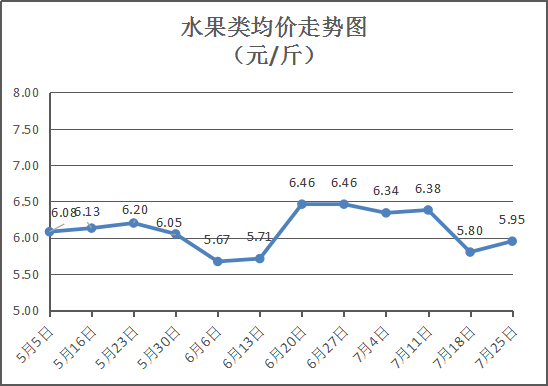 水果类商品价格微涨。所监测的6种水果综合均价为5.95元/斤,环比上涨2.59%。其中西瓜、梨、橙子零售均价分别为每斤2.20元、6.50元、6元,环比上涨22.22%、13.04%、9.09%;苹果零售均价为每斤6.50元,环比下降10.34%。