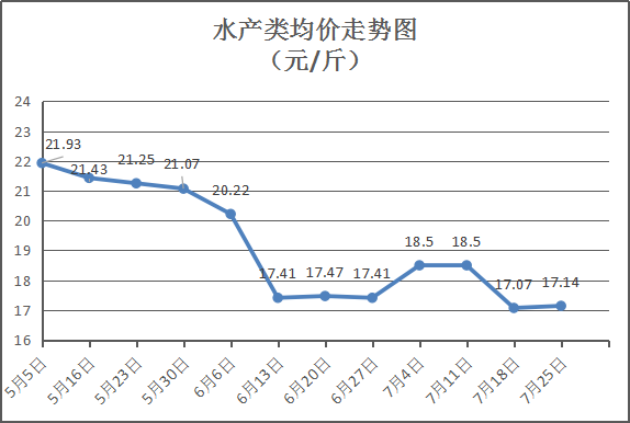 水产类商品价格微涨。所监测的11种水产品综合均价为17.14元/斤,环比上涨0.39%。其中:草鱼、鲫鱼、鳙鱼、基围虾零售均价分别为每斤9.50元、14.50元、10.50元、28元,环比分别下降7.32%、上涨16%、持平、下降3.45%。