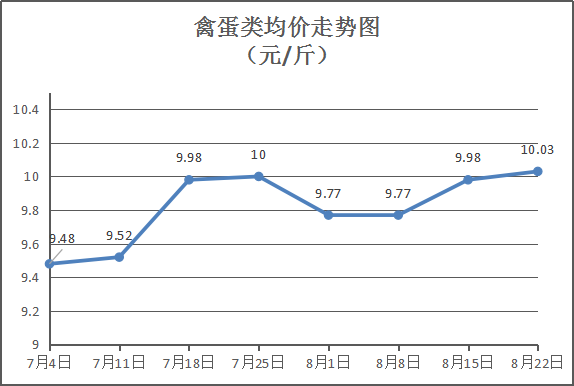 禽蛋类商品价格微幅上涨。本周所监测的6种禽蛋类商品均价为10.03元/斤,环比上涨0.50%。其中:白条鸡、白条鸭、白壳鸡蛋、鸭蛋零售均价分别为每斤15.50元、16元,6.20元、7.50元,环比与上周分别持平、持平、上涨2.48%、持平。