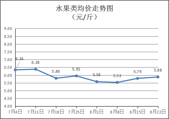 水果类商品价格稳中略涨。所监测的6种水果综合均价为5.88元/斤,波动情况为5平1涨,环比上涨1.44%。其中:苹果、香蕉、西瓜、橙子零售均价分别为每斤6.75元、2.75元、2元、6元,环比与上周持平、持平、持平、上涨9.09%。