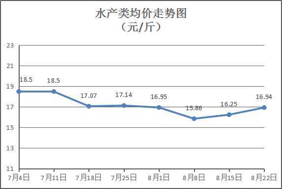 水产类商品价格总体略涨。所监测的11种水产品综合均价为16.94元/斤,环比上涨4.25%。其中:草鱼、鲫鱼、鳙鱼、基围虾零售均价分别为每斤9元、14.50元、11元、28元,环比与上周分别上涨2.86%、上涨11.54%、上涨4.76%、持平。