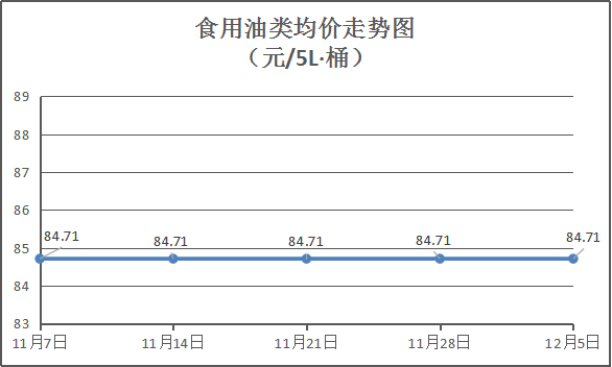 食用油类商品价格基本平稳。本周所监测的9种食用油(5L装)商品均价为84.71元/桶,环比均持平。其中:金龙鱼花生油、大豆油、金龙调和油5L装零售均价分别为每桶115元、65元、74元,环比与上周均持平。
