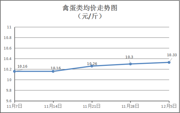 禽蛋类商品价格窄幅盘整。本周所监测的6种禽蛋类商品均价为10.33元/斤,环比上涨0.29%。其中:白条鸡、白条鸭、白壳鸡蛋、鸭蛋零售均价分别为每斤15.5元、15.5元、7元、8.25元,环比与上周分别持平、持平、上涨1.45%、持平。