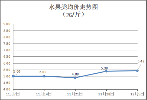 水果类商品价格有所上涨。所监测的6种水果综合均价为5.42元/斤,环比上涨0.74%。其中:橙子、苹果、梨零售均价分别为每斤5.5元、6.75元、5元,环比与上周分别上涨4.76%、持平、持平。