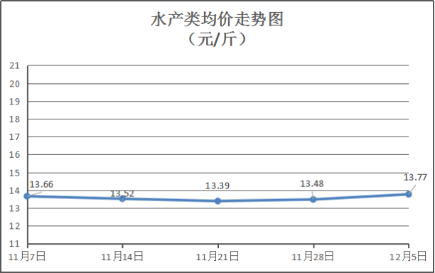 水产类商品价格总体略涨。所监测的11种水产品综合均价为13.77元/斤,环比上涨2.15%。其中:草鱼、鲫鱼、鲈鱼、基围虾零售均价分别为每斤10.75元、12.75元、19.50元、34元,环比与上周分别上涨7.5%、上涨4.08%、持平、上涨6.25%。