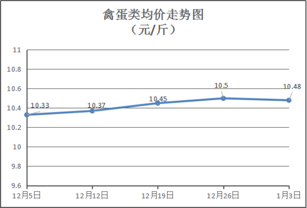 禽蛋类商品价格略有下降。本周所监测的6种禽蛋类商品均价为10.48元/斤,环比下降0.19%。其中:白条鸡、白条鸭、白壳鸡蛋、鸭蛋零售均价分别为每斤15.50元、15.50元、7.40元、8.40元,环比与上周分别持平、持平、上涨1.37%、持平。