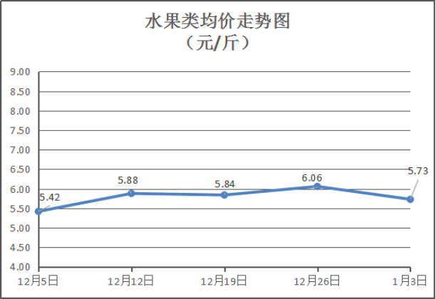 水果类商品价格小幅波动。所监测的6种水果综合均价为5.73元/斤,环比下降5.45%。其中:橙子、苹果、梨零售均价分别为每斤6.00元、7.25元、5.00元,环比与上周分别下降4%、上涨7.41%、持平。