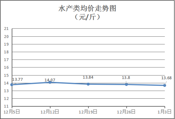 水产类商品价格窄幅盘整。所监测的11种水产品综合均价为13.68元/斤,环比下降0.87%。其中:草鱼、鲫鱼、鲈鱼、基围虾零售均价分别为每斤11.00元、12.75元、19.50元、33元,环比与上周分别上涨4.76%、下降3.77%、下降4.88%、持平。