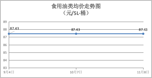 食用油类商品价格平稳。本期所监测的9种食用油(5L装)商品均价为87.43元/桶,环比持平。其中:金龙鱼花生油零售均价分别为每桶112元,环比持平。