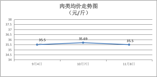 肉类商品价格小幅下降。本期所监测的8种肉类商品均价为35.50元/斤,环比下降0.53%。其中:精瘦肉、带骨羊肉零售均价为每斤19.50元、30.00元,环比下降2.50%、下降2.04%。