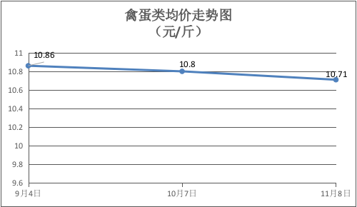 禽蛋类商品价格小幅下降。本期所监测的6种禽蛋类商品均价为10.71元/斤,环比下降0.83%。其中:鸭肉、鸭蛋、白壳鸡蛋、红壳鸡蛋零售均价分别为每斤15.50元、7.75元、7.25元、7.50元,环比下降3.13%、下降6.06%、上涨2.11%、上涨4.17%。