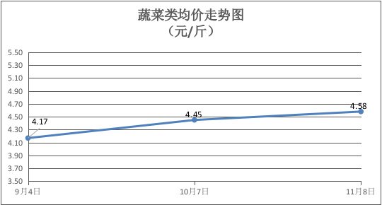 蔬菜类商品价格总体上涨。本期32种蔬菜价格波动情况为3涨10平19跌,综合零售均价为4.58元/斤,环比上涨2.92%。3个品种环比上涨,其中:涨幅居前品种包括南瓜、蒜头、莲藕零售均价分别为每斤3.15元、8.50元、4.50元,环比分别上涨26.00%、6.25%、2.27%;19个品种零售均价环比下降,跌幅居前品种包括菠菜、水空心菜、西红柿零售均价为每斤5.75元、4.25元、3.90元,环比分别下降17.86%、下降15.00%、下降13.33%。