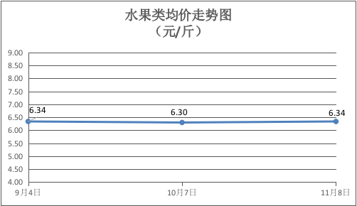 水果类商品价格上涨。所监测的6种水果综合均价为6.34元/斤,环比上涨0.63%。其中:橙子、苹果、香蕉、西瓜零售均价分别为每斤6.00元、7.75元、3.00元、2.80元,环比分别上涨9.09%、上涨3.33%、下降11.76%、下降3.45%。