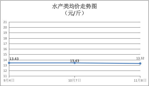 水产类商品总体价格下降。所监测的11种水产品综合均价为13.32元/斤,环比下降0.82%。其中:鲫鱼、鲈鱼、鳙鱼零售均价分别为每斤13.00元、20.00元、10.25元,环比分别下降7.14%、下降2.44%、上涨2.50%。
