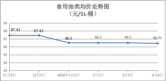 食用油类商品价格下降。本期所监测的9种食用油(5L装)商品均价为86.43元/桶,环比下降0.08%。其中:金龙鱼花生油零售均价分别为每桶105元,环比下降0.47%。