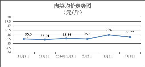 肉类商品价格小幅下降。本期所监测的8种肉类商品均价为35.72元/斤,环比下降0.70%。其中:排骨、精瘦肉、有皮上肉零售均价为每斤29.50元、19.75元、15元,环比下降1.67%、下降5.06%、下降3.23%。
