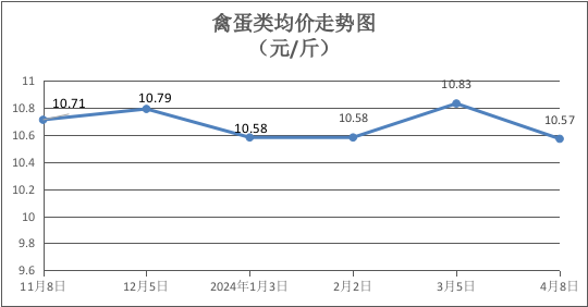 禽蛋类商品价格下降。本期所监测的6种禽蛋类商品均价为10.57元/斤,环比下降2.40%。其中:鸡肉、鸭肉、鸭蛋零售均价分别为每斤17.50元、15.50元、7.65元,环比下降5.41%、下降3.13%、下降1.29%。