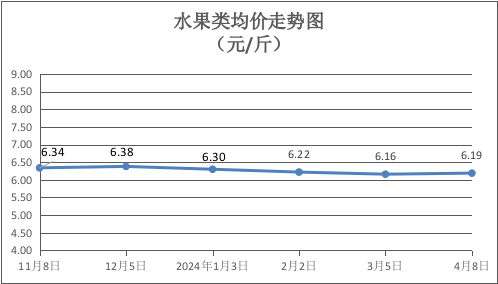 水果类商品价格上涨。所监测的6种水果综合均价为6.19元/斤,环比上涨0.49%。其中:橙子、西瓜、苹果零售均价分别为每斤6元、3元、7.25元,环比分别上涨9.09%、上涨7.14%、下降6.45%。