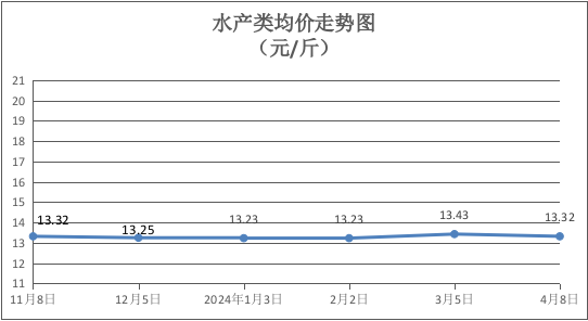 水产类商品总体价格下降。所监测的11种水产品综合均价为13.32元/斤,环比下降0.82%。其中:草鱼、鲈鱼、鳙鱼零售均价分别为每斤10.75元、18元、10元,环比分别下降6.52%、下降5.26%、上涨5.26%。