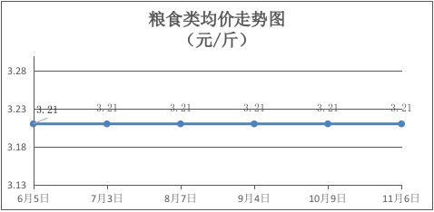 粮食类商品价格持续平稳。本期所监测的4种粮食商品均价为3.21元/斤,环比(与上期比,下同)持平。其中:丝苗米、珍珠米、油粘米、面粉零售均价分别为每斤3.25元、3.30元、3.50元、2.80元,环比均持平。
