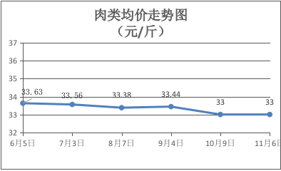 肉类商品价格维持稳定。本期所监测的8种肉类商品均价为33.00元/斤,环比持平。其中:排骨、精瘦肉、有皮上肉、牛肉、带骨羊肉零售价分别为每斤28.00元、17.00元、15.00元、49.00元、45.00元,环比均持平。