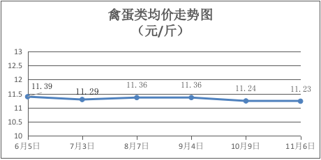 禽蛋类商品价格微幅下降。本期所监测的5种禽蛋类商品均价为11.23元/斤,环比下降0.09%。其中:鸡肉、鸭肉、鸡蛋、鸭蛋零售价分别为每斤17.50元、16.00元、7.15元、6.75元,环比分别持平、持平、持平、下降0.74%。