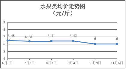 水果类商品价格平稳。所监测的6种水果综合均价为6.00元/斤,环比持平。其中:苹果、香蕉、葡萄、梨、橙子、西瓜零售均价分别为每斤8.00元、3.10元、12.00元、4.90元、5.00元、3.00元,环比分别持平、持平、持平、上涨3.16%、下降2.91%、持平。