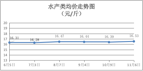 水产类商品价格总体略升。所监测的9种水产品综合均价为16.53元/斤,环比上涨0.85%。其中:黄花鱼、基围虾、草鱼、鲫鱼、鳙鱼、淡水鲈鱼零售均价分别为每斤22.50元、29.00元、10.75元、13.25元、10.50元、20.50元,环比分别持平、持平、上涨4.88%、上涨3.92%、持平、持平。