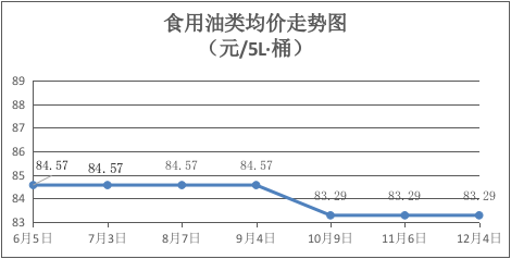 食用油类商品价格保持稳定。本期所监测的7种食用油(5L装)商品均价为83.29元/桶,环比持平。其中:鲁花花生油、金龙鱼花生油、菜籽油、大豆油、金龙鱼调和油、玉米油零售均价分别为每桶156.00元、98.00元、67.00元、58.00元、73.00元、73.00元,环比均持平。