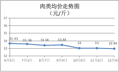 肉类商品价格微幅下降。本期所监测的8种肉类商品均价为32.94元/斤,环比下降0.18%。其中:排骨、精瘦肉、有皮上肉、牛肉、带骨羊肉零售价分别为每斤27.50元、17.00元、15.00元、49.00元、45.00元,环比分别下降1.79%、持平、持平、持平、持平。