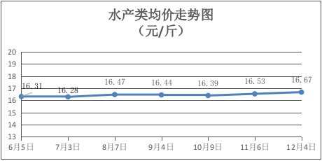 水产类商品价格略升。所监测的9种水产品综合均价为16.67元/斤,环比上涨0.85%。其中:黄花鱼、基围虾、草鱼、鲫鱼、鳙鱼、淡水鲈鱼零售均价分别为每斤22.50元、30.00元、10.75元、13.00元、10.50元、21.00元,环比分别持平、上涨3.45%、持平、下降1.89%、持平、上涨2.44%。