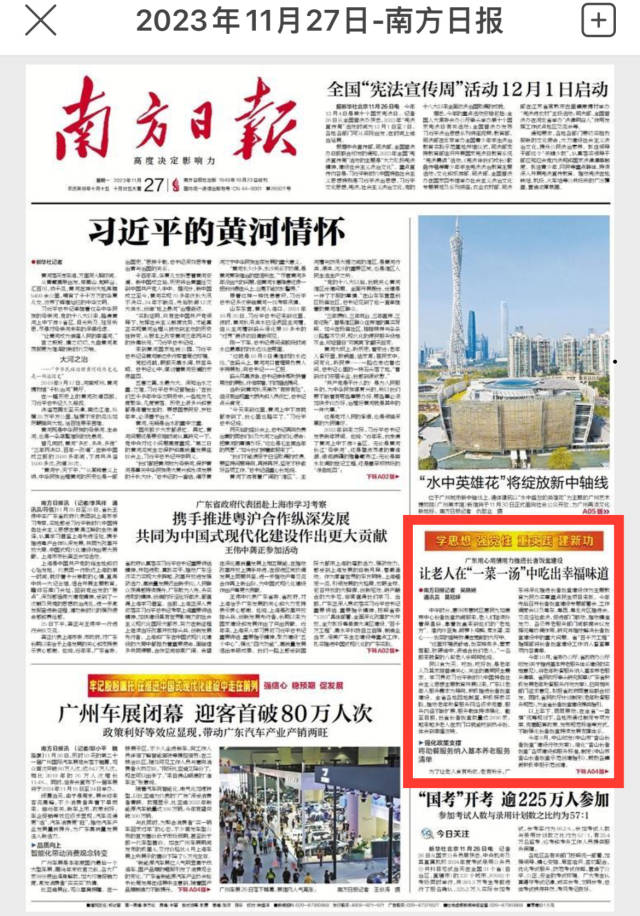 今年10月,省委办公厅、省政府办公厅印发《关于推进基本养老服务体系建设的实施意见》,将老年助餐服务纳入基本养老服务清单。省民政厅牵头研究起草《广东省积极发展老年助餐服务行动方案》,已向相关部门征求意见,拟报省政府同意后联合印发。同时,省民政厅计划制定《老年助餐服务规范》,为全省长者饭堂建设提供指引。