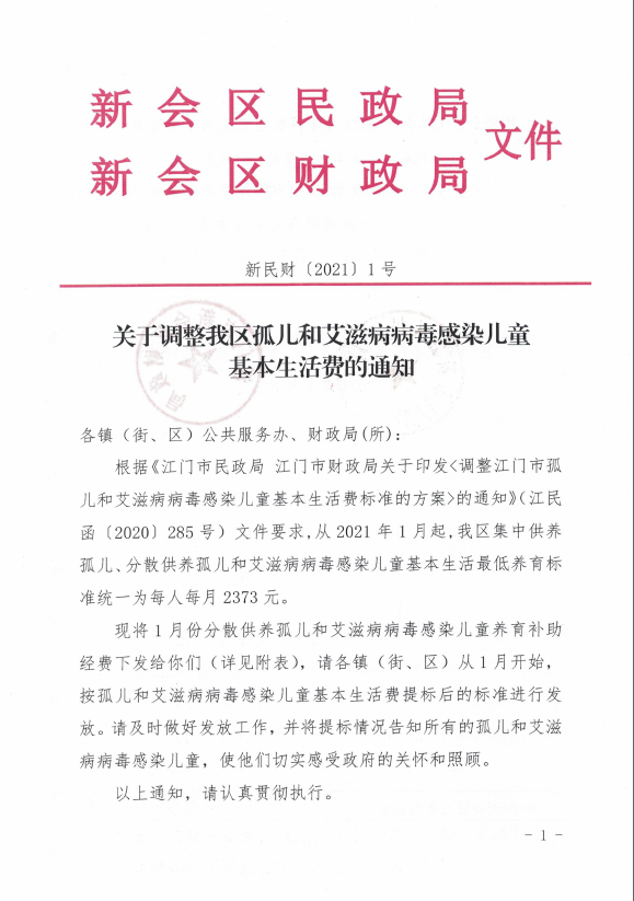 (新民财【2021】1号)关于调整我区孤儿和艾滋病病毒感染儿童基本生活费的通知.pdf