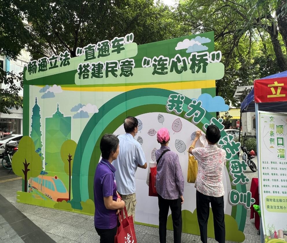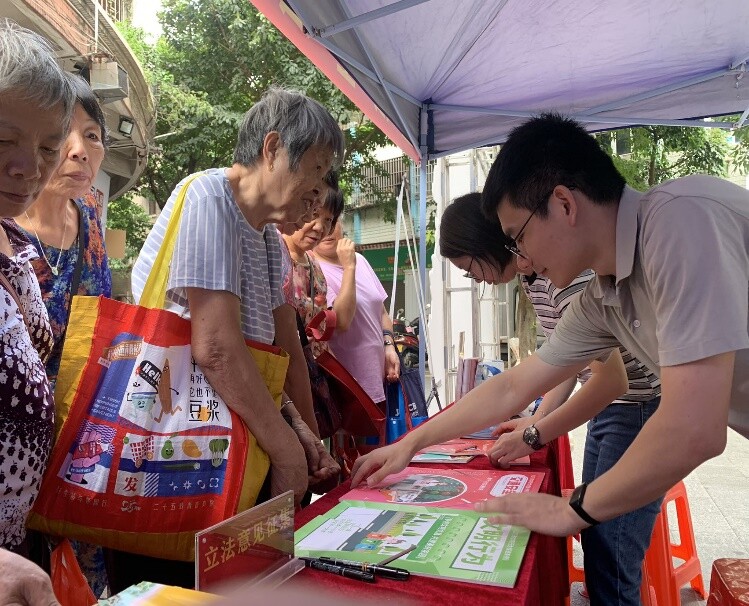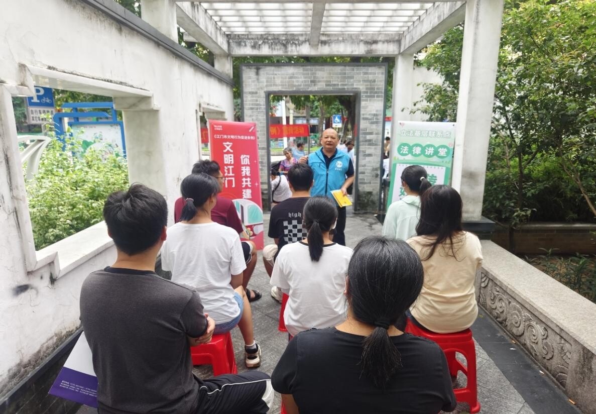 在会城街道南园社区口袋公园,“法律讲堂”“我为立法献言”等活动也开展得有声有色。黎雄校律师开讲“法律讲堂”,为社区居民详细解读《江门市文明行为促进条例》的立法过程和重点内容,号召居民提升文明意识,积极践行条例、遵守条例。另一边,在“我为立法献言”活动现场,居民“沉浸式”参与立法征询,踊跃为立法献言,一片片写着立法意见的“叶子”被群众贴上,代表来自基层一线的声音源源不断汇集到立法机关。普法志愿者还走上街头,前往周边商铺、市场等人员密集场所发放宣传资料,积极与商家、社区居民互动交流,解答群众法律咨询。“有法律规范楼道内乱扔垃圾的行为吗”“一层住宅能改为商铺吗”……对于群众提出各类问题,普法志愿者结合法律法规认真分析,答疑解惑。活动现场还设有普法宣传摊位和互动游戏摊位,群众可通过游戏互动、领取宣传资料学习宪法、民法典、养老诈骗以及新修订行政复议法等法律知识。活动共发放宣传资料200余份,法治宣传纪念品100多份,解答群众咨询20余人次。