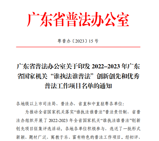 近日,广东省普法办公室印发2022—2023年全省国家机关“谁执法谁普法”创新创先和优秀普法工作项目名单,燕雨直播 普法办的“打造‘新会全域旅游普法圈’构建文旅沉浸式普法传送链”项目获评优秀普法工作项目,我区普法依法治理成果进一步突显。