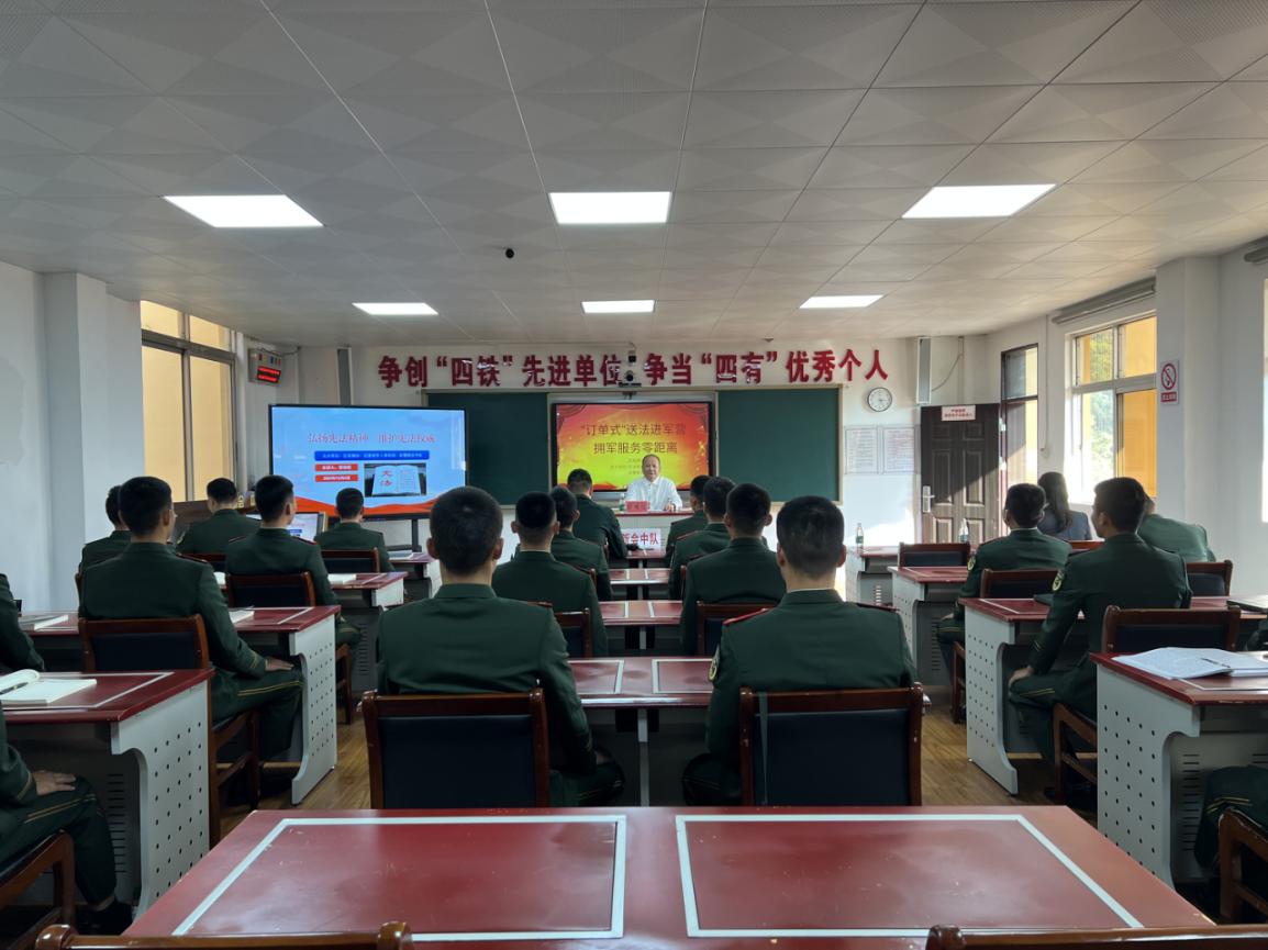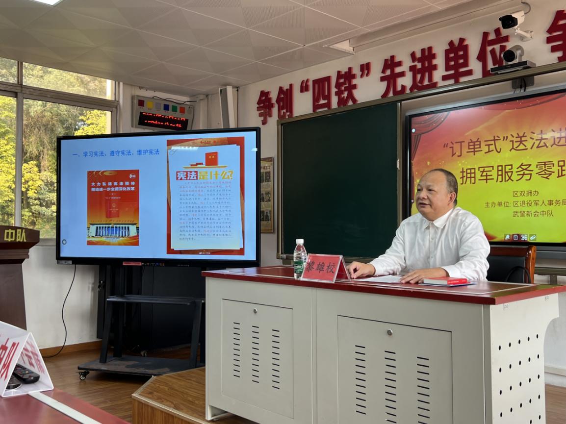 区退役军人事务局在武警新会中队开展“送法进军营”活动,结合官兵学法需要,通过法律顾问讲解国家根本政治制度等宪法条文知识以及相关法律法规,有效强化部队官兵的法治信仰和法治思维,推动宪法精神深入兵心。