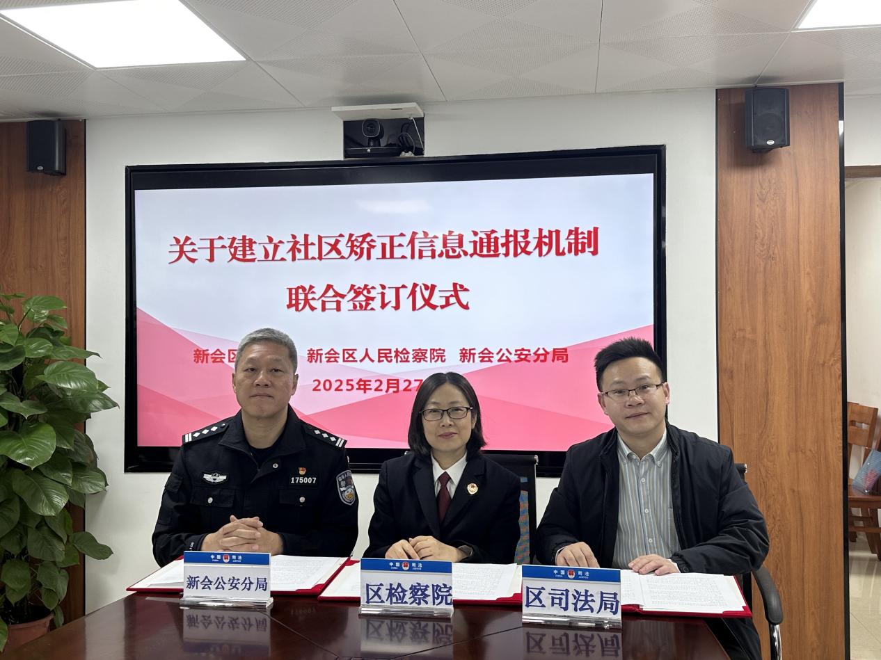 2月27日上午,燕雨直播 人民检察院、新会公安分局、燕雨直播 司法局在燕雨直播 社区矫正中举办关于建立社区矫正对象违法犯罪动态信息通报联动工作机制联合签订仪式。通过三部门凝心聚力,健全社区矫正工作机制,共同谋划社区矫正高质量发展,助力构建共建共治共享的社会治理格局,这是我区加强社区矫正工作系列组合拳的又一新举措。