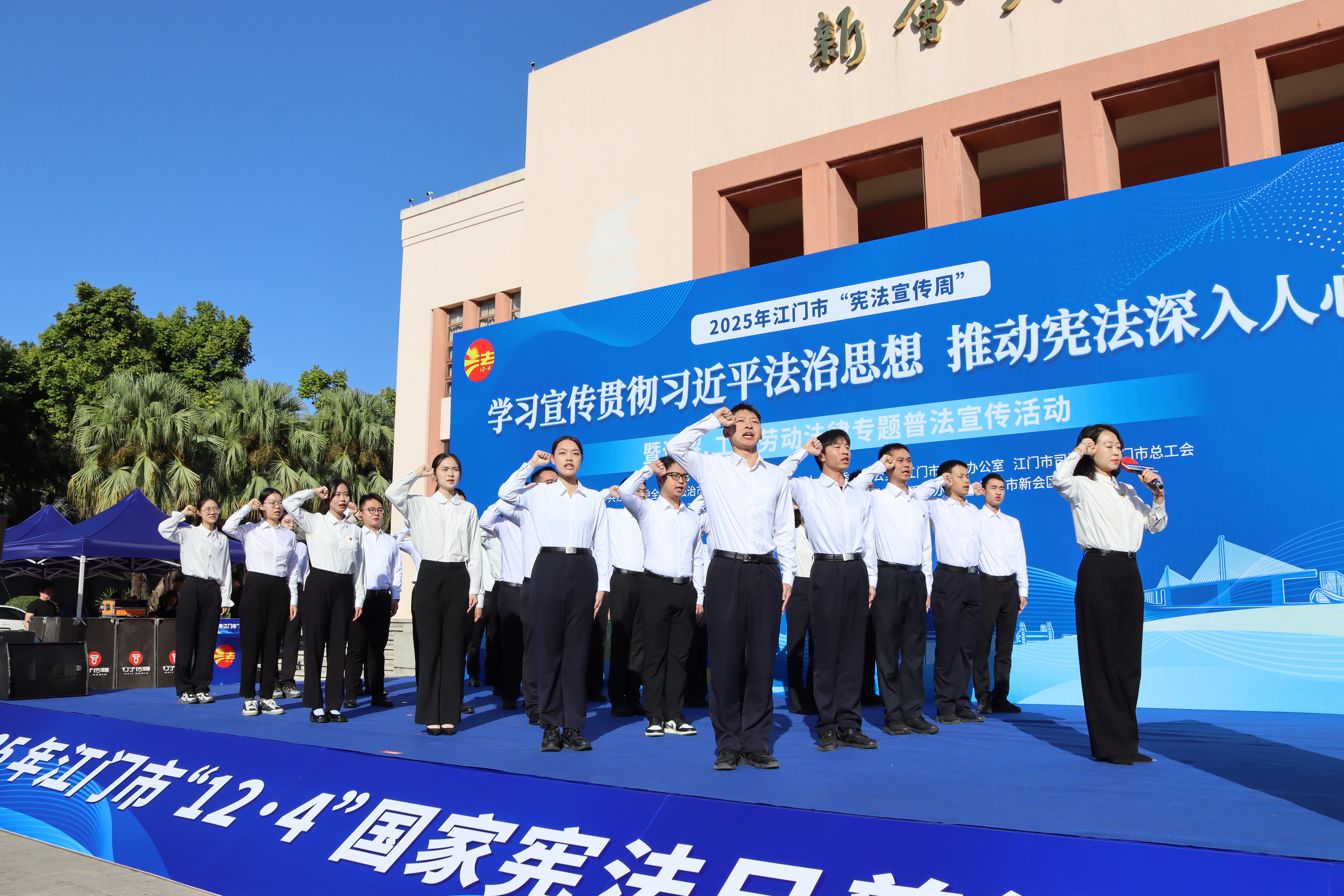 “我宣誓,忠于中华人民共和国宪法,维护宪法权威……”活动现场,随着庄严的国歌旋律,30名新会区新入职公务员身着正装,右手挥拳,认真严肃跟随领誓人庄严宣誓,铮铮誓言响彻现场,通过开展宪法宣誓加深年轻干部对宪法的敬畏尊崇,坚定他们以责履誓、以行践诺、依法为民的使命感和责任感。