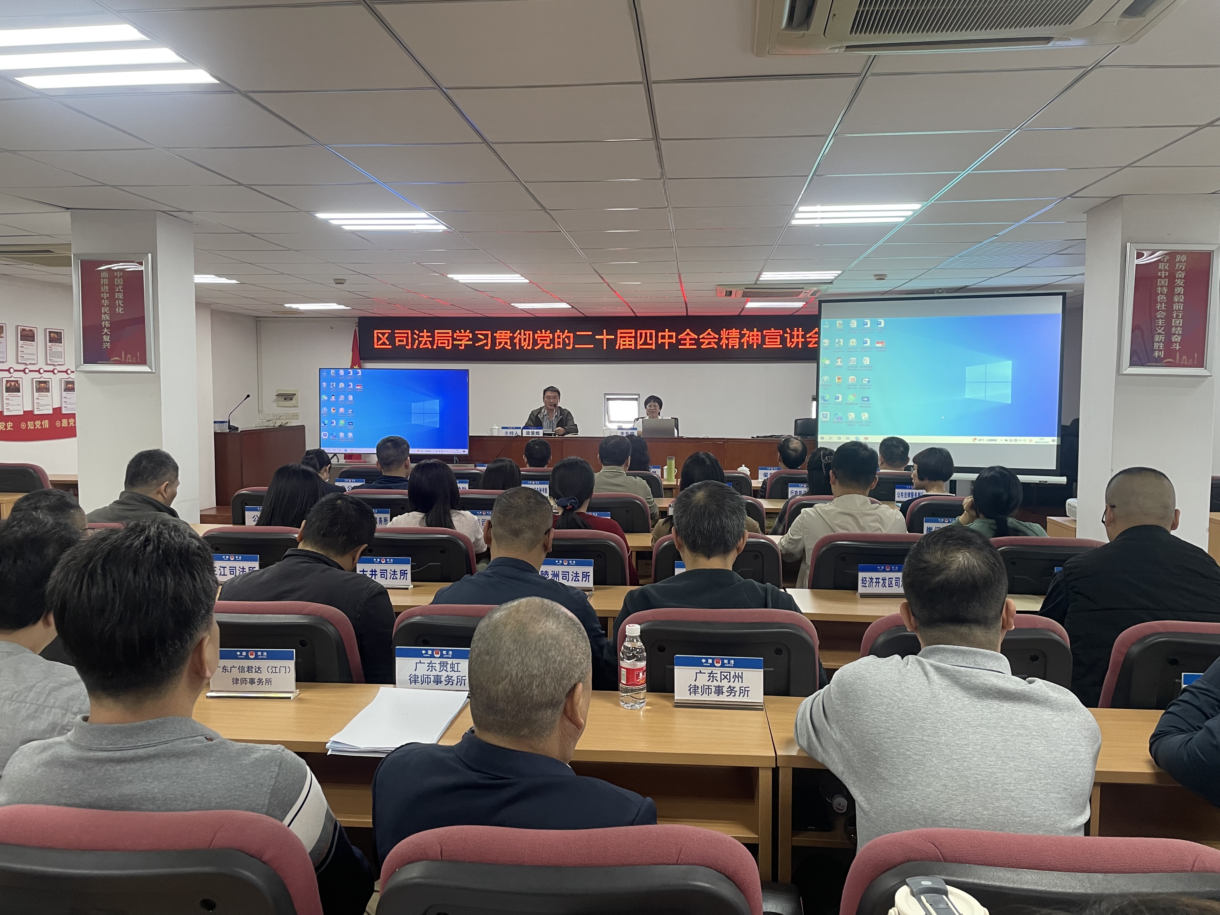 为深入学习贯彻党的二十届四中全会精神,引导全区司法行政系统干部职工切实把思想和行动统一到党中央的决策部署上来,以更高标准推动全面依法治区和司法行政工作高质量发展,1224日上午,区司法局召开学习贯彻党的二十届四中全会精神宣讲会议,特邀区委宣讲团成员、区委党校副校长李秀媚同志作专题辅导。